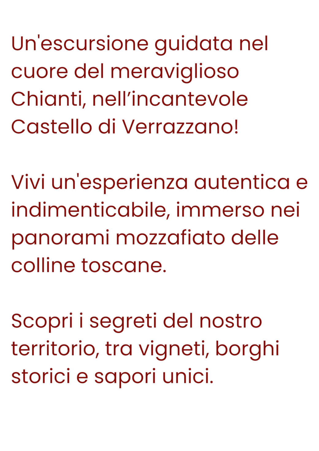 Un’escursione guidata nel cuore del meraviglioso Chianti, nell’incantevole Castello di Verrazzano! Un viaggio sensoriale tra i sapori e i profumi di una delle regioni vinicole più famose al mondo, dove ogni sorso racconta una storia millenaria. Vivi un’esperienza autentica e indimenticabile, immerso nei panorami mozzafiato delle colline toscane, dove la natura dipinge quadri di rara bellezza. Scopri le tradizioni culinarie e vinicole che rendono questa terra unica, un vero tesoro di sapori e saperi. Un’opportunità per connettersi con l’anima più autentica della Toscana, lasciandosi avvolgere dalla sua magia.